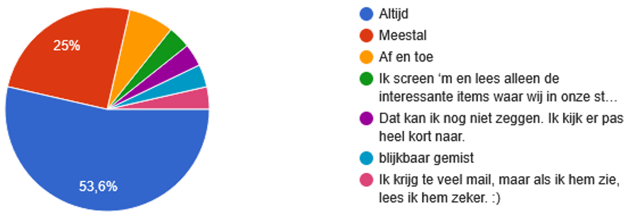 Zoals de grafiek laat zien zitten we iets boven de 75 % met positieve antwoorden als we altijd en meestal samentellen.Voor ons bemoedigend om de nieuwsbrief te blijven publiceren.